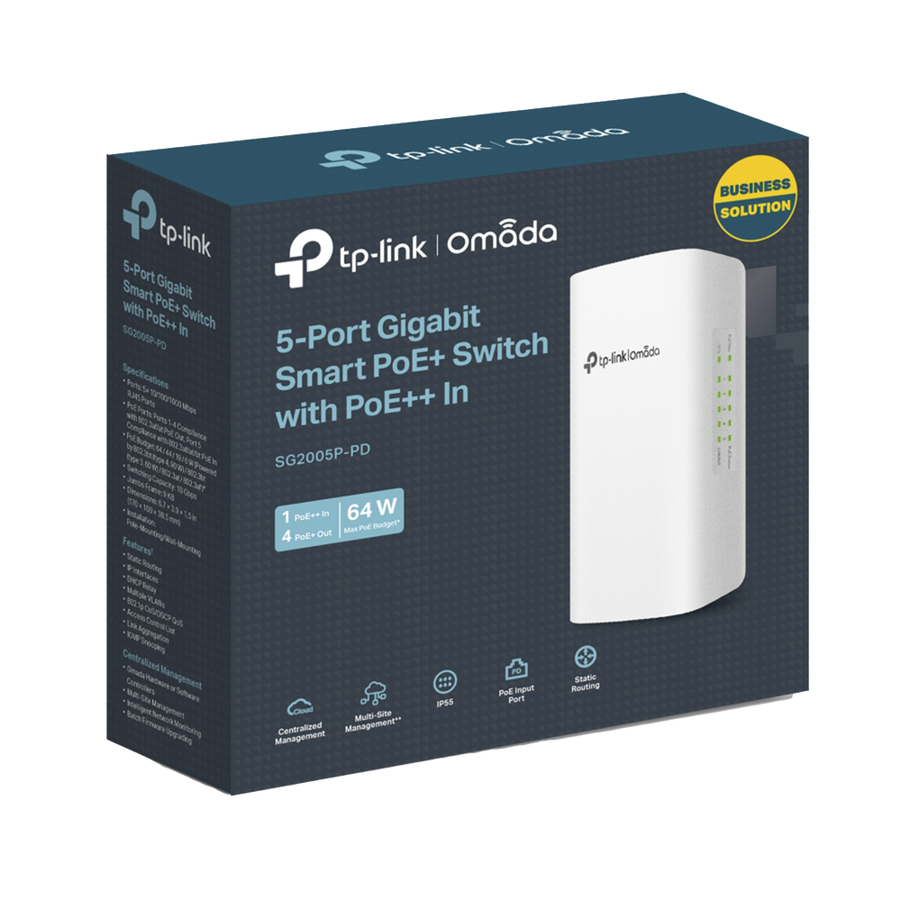 Switch PoE Omada Para Exterior / 1 Puerto PoE++ IN 802.3 af/at/bt / 4 Puertos PoE+ OUT Gigabit / Adminstración Centralizada Omada